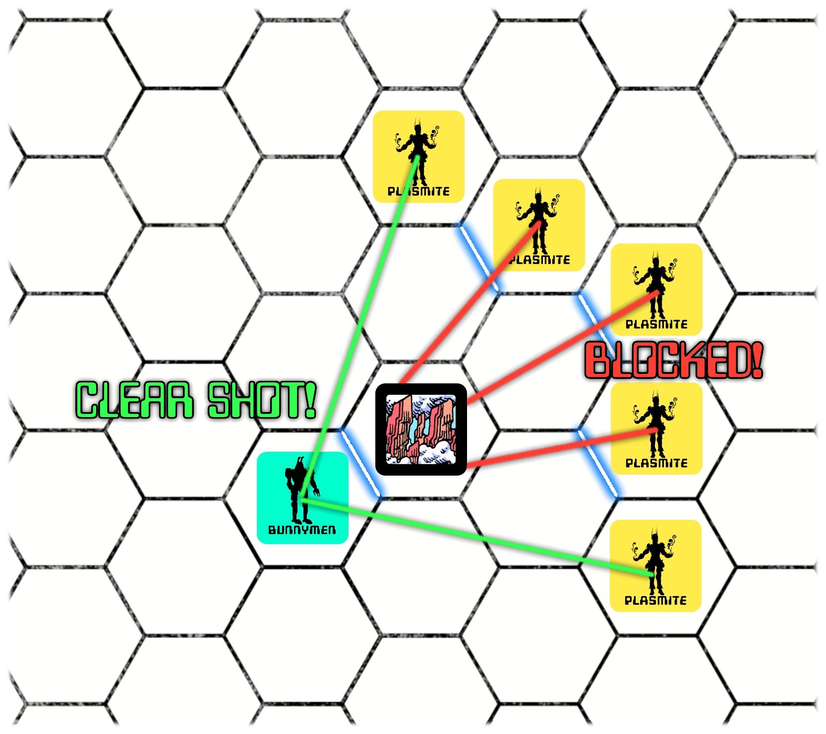 Fig 1. The yellow Plasmites attempt a ranged attack on the blue Bunnymen. Note that the Plasmites whose line of sight is blocked, fire their projectiles through a hex-edge that parallels the edge between the Bunnymen and Spire terrain hexes.